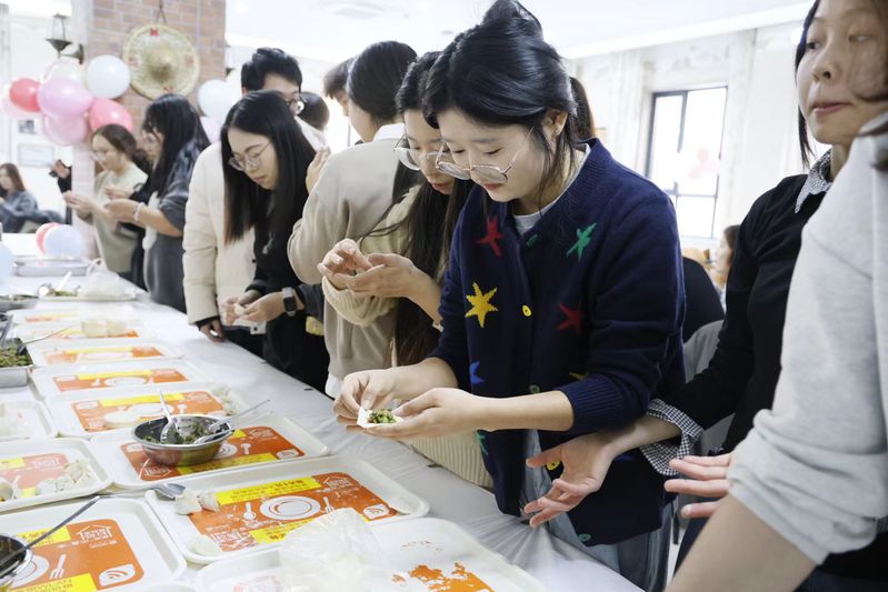 学院师生齐聚学校禾园食堂,大家围坐在长桌旁,和面、揉面、擀皮、调馅、包饺子,忙得热火朝天。活动中师生们欢声笑语,一边聊学习成长、分享自己家乡的冬至习俗,一边相互学习、切磋包饺子的技巧。